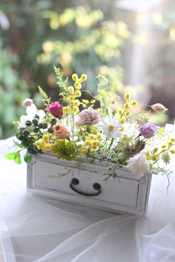アレンジは未経験の方ばかりです。お一人でのご参加、不器用でできるかなという方も講師が基礎からしっかりサポートさせていただきますのでご安心下さい。ウェディングやお祝い、ギフトなどプロ級の作品が完成いたします。