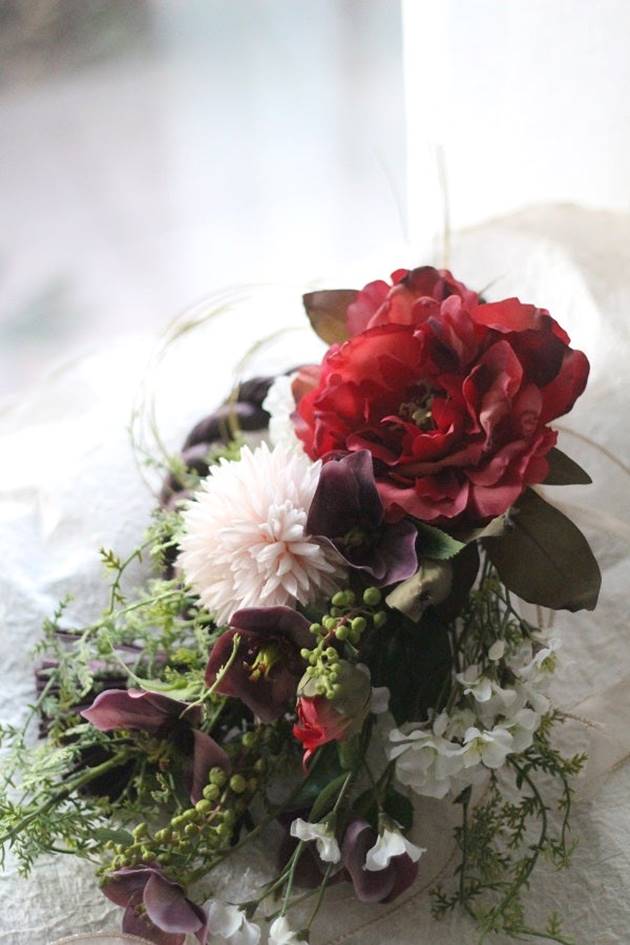 今年は大輪のピオニーにクリスマスローズを合わせて大人っぽい印象に。