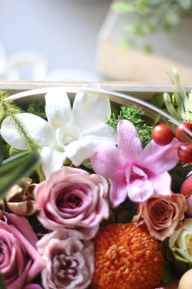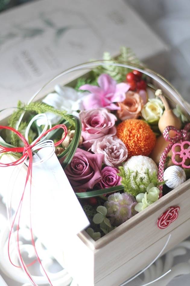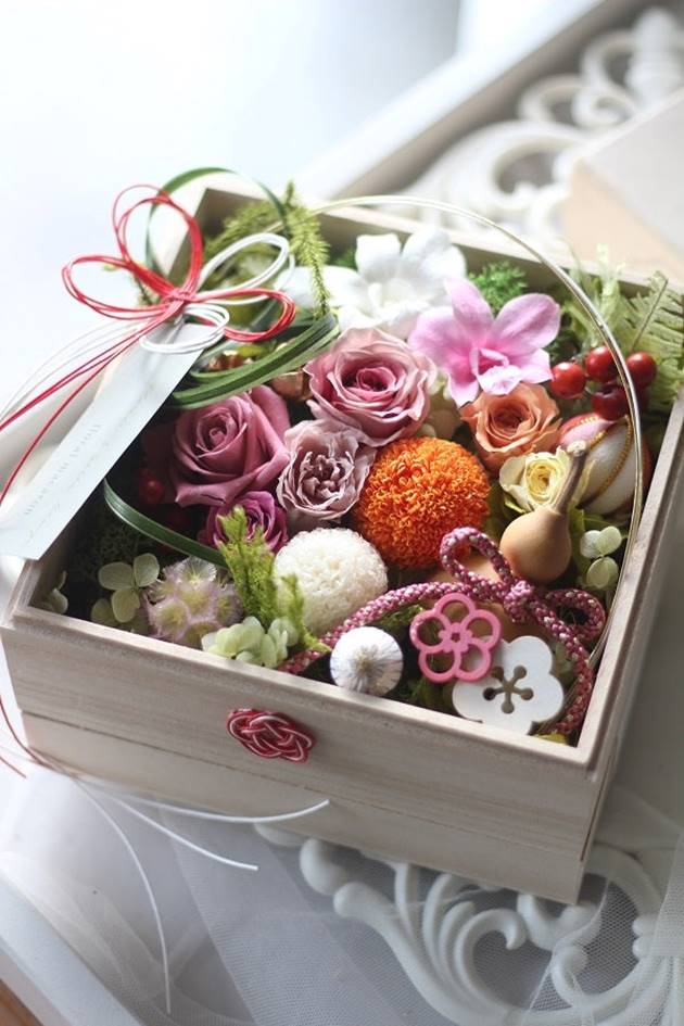 桐箱のフタを開けた瞬間、彩豊かな瑞々しいプリザーブドフラワーが箱いっぱいに♪
