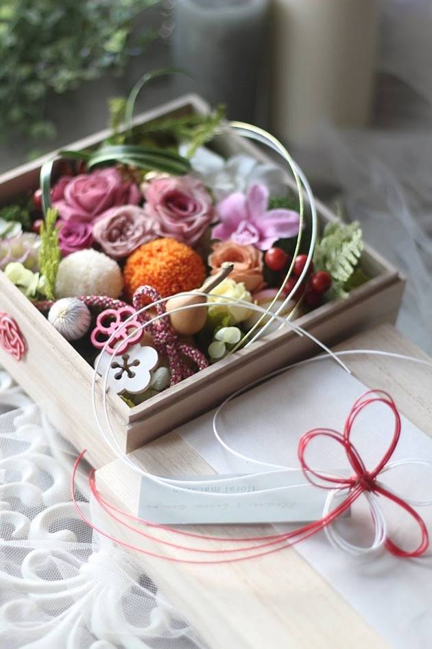 新春アレンジのご案内♪おせち風フラワーボックスと2wayしめ飾り、ちょっとリッチなお花で華やかな新年を/名古屋フラワーアレンジメント教室フローラルマカロン