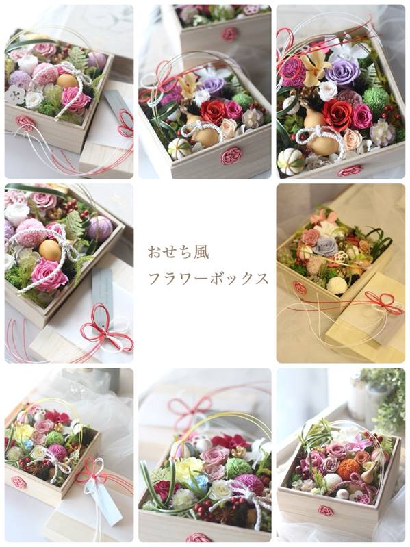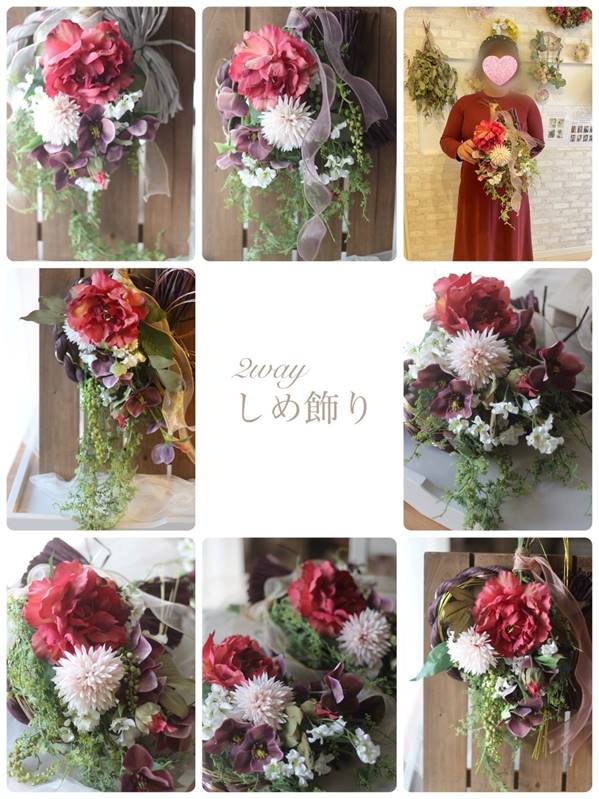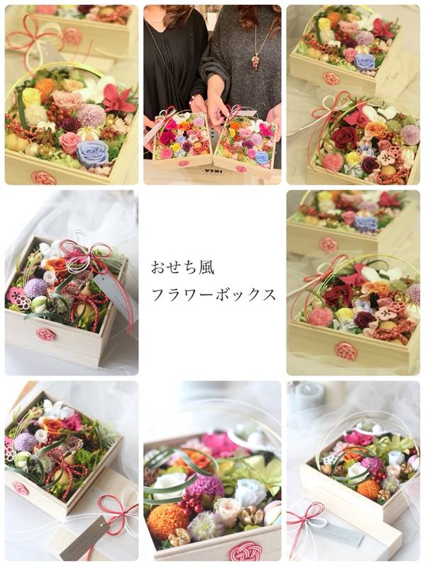昨年末、季節のレッスンでお作りいただいた「おせち風フラワーボックス」と「しめ飾り」をご紹介させていただきます。