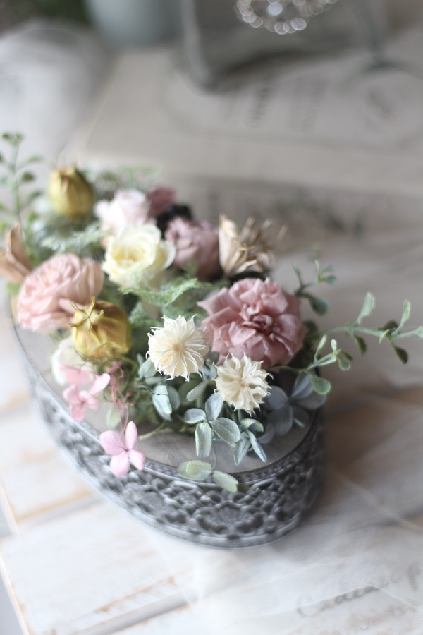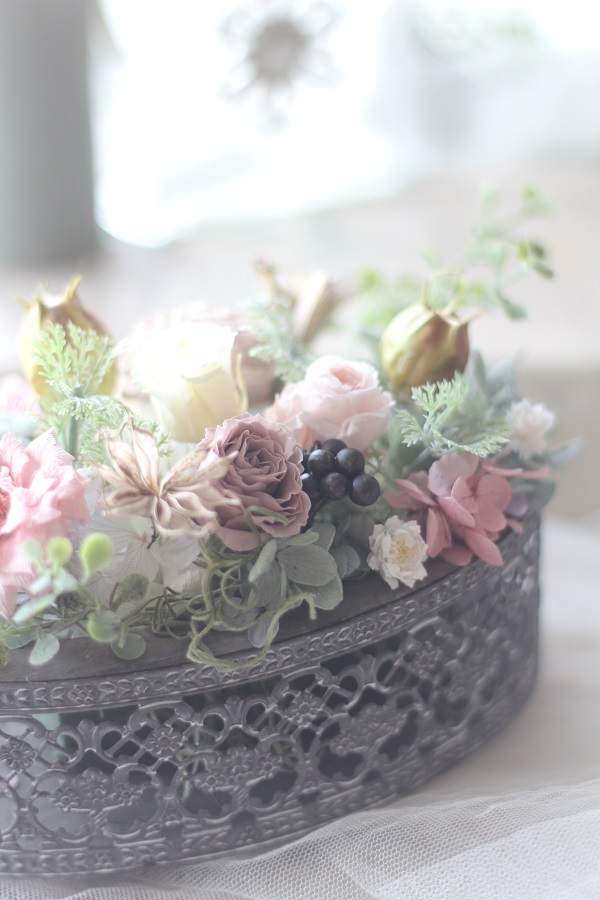 自然素材のプリザーブドローズや小花をナチュラルに飾っていただきます。